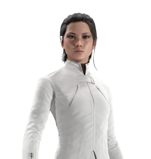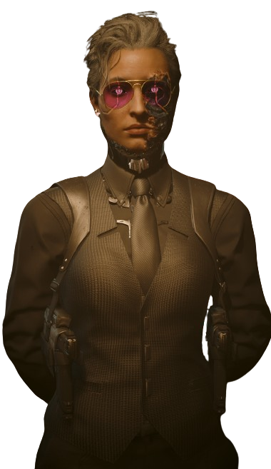 Viste con trajes impecables y minimalistas, siempre adecuados para cualquier situación, desde la sala de juntas hasta los oscuros callejones de Night City. Sus movimientos son calculados y gráciles, evidenciando años de entrenamiento en protocolo corporativo y diplomacia.
